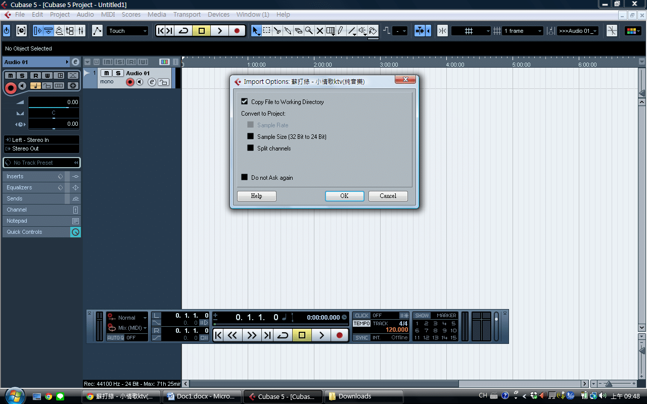 ▲音軌開啟後,可以導入伴奏音檔,將伴奏音檔直接拖曳到開好的音軌,並選擇copy file to working directory,會將音檔拷貝到目前錄音程式工作的目錄中(也可以選擇不拷貝)