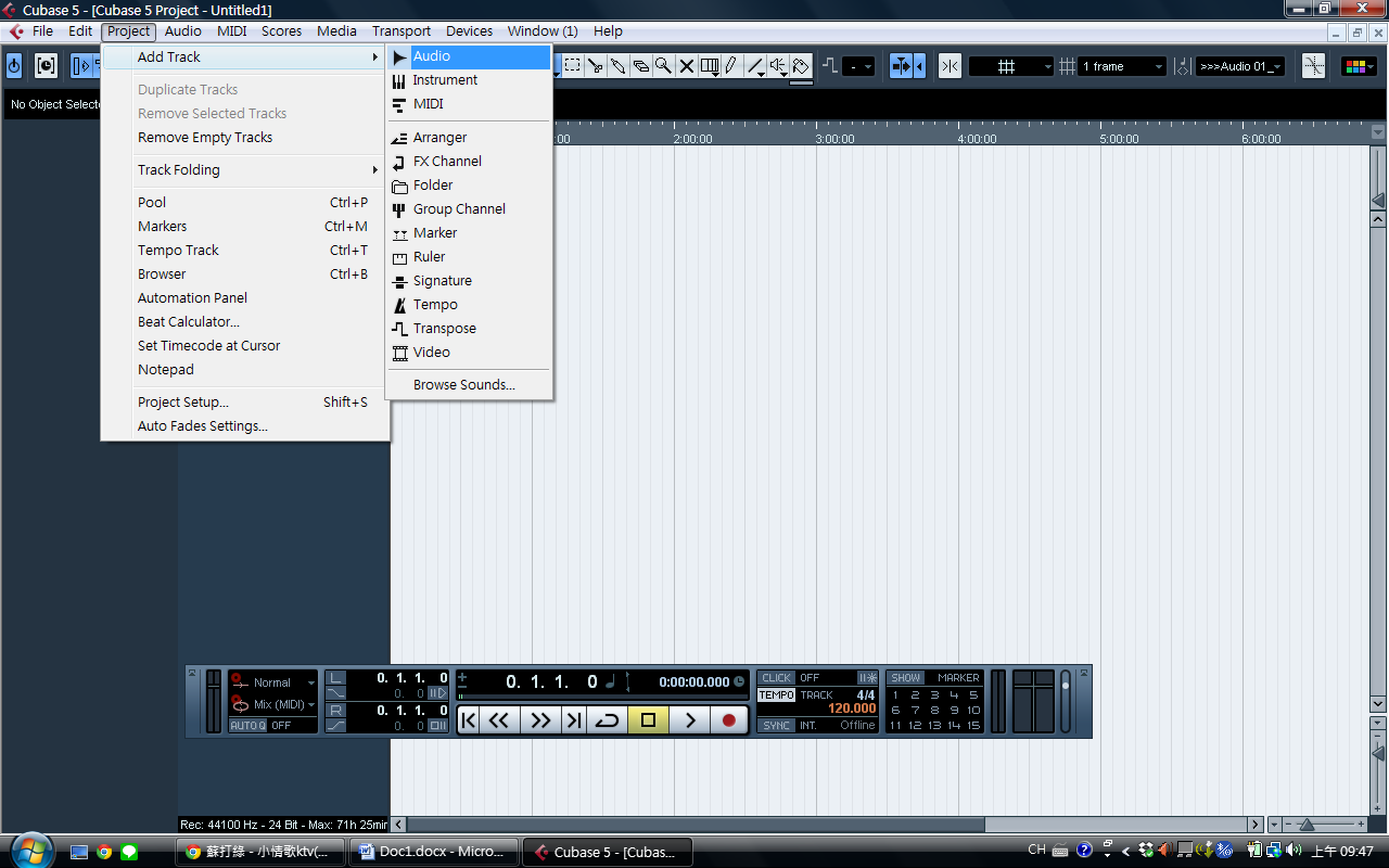 ▲完成麥克風設定之後,即可開新音軌,開始錄音,點選project-add track開啟音軌,錄音時使用mono音軌即可。