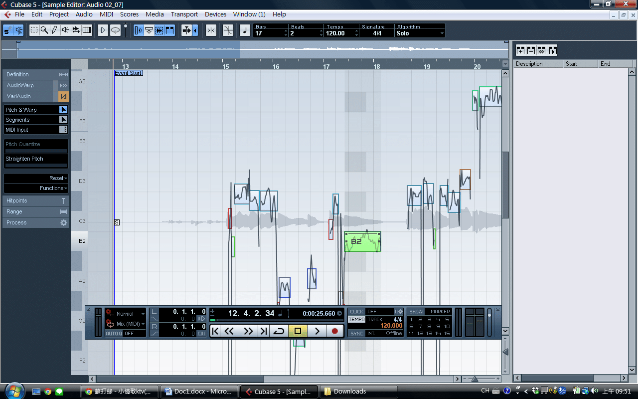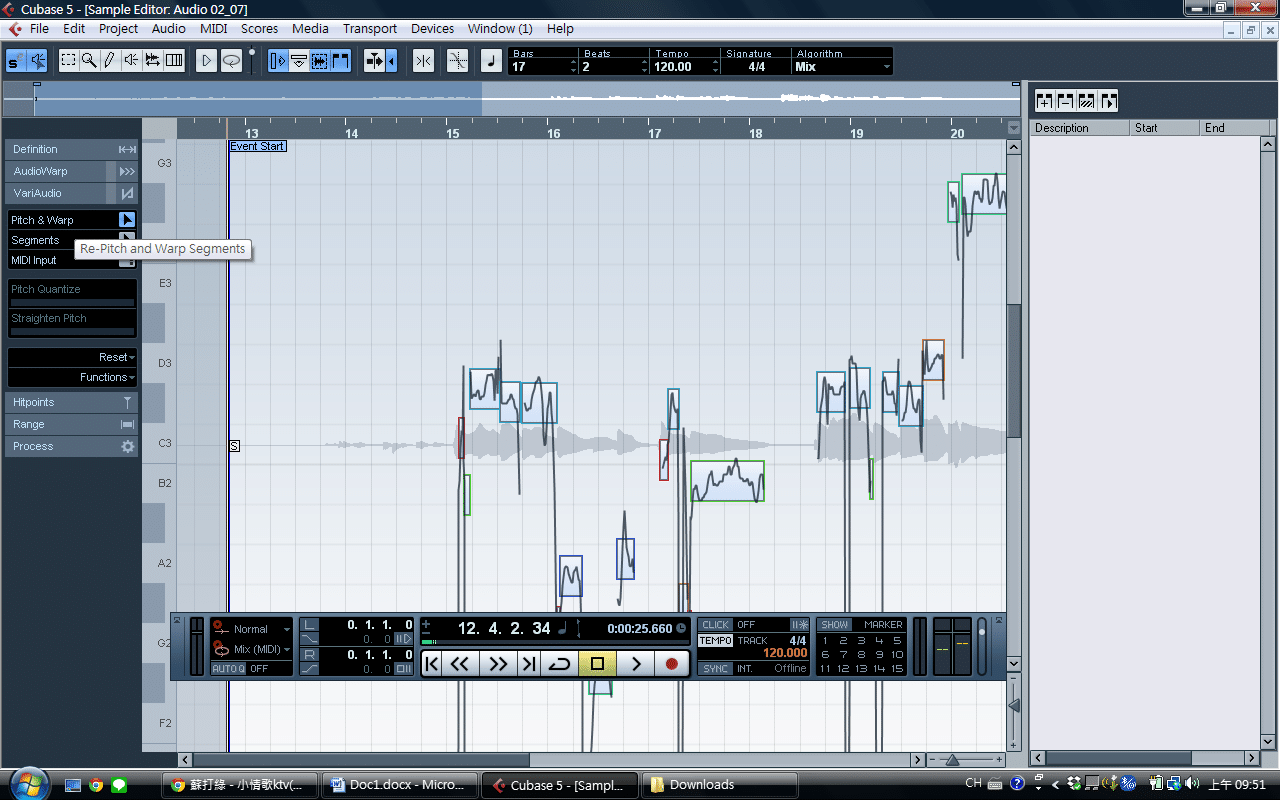 如果音唱不準想要調整音高,可以點選所錄的音檔兩下之後,會進入編輯模式,此時點選左邊的pitch&warp,程式