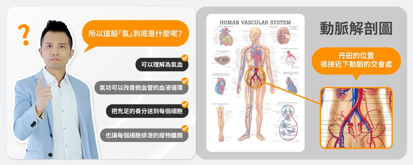 結果沒想到我練不到10分鐘就感覺到手指麻麻的,腹部有一股熱源往上走。所以這股「氣」到底是什麼呢?比較好理解的說法,可以理解為氣血。氣功可以改善微血管的血液循環,把充足的養分送到每個細胞,也讓每個細胞排泄的廢物離開,然而如果我們看動脈解剖圖的話會發現,其實丹田的位置很接近下動脈的交會處。