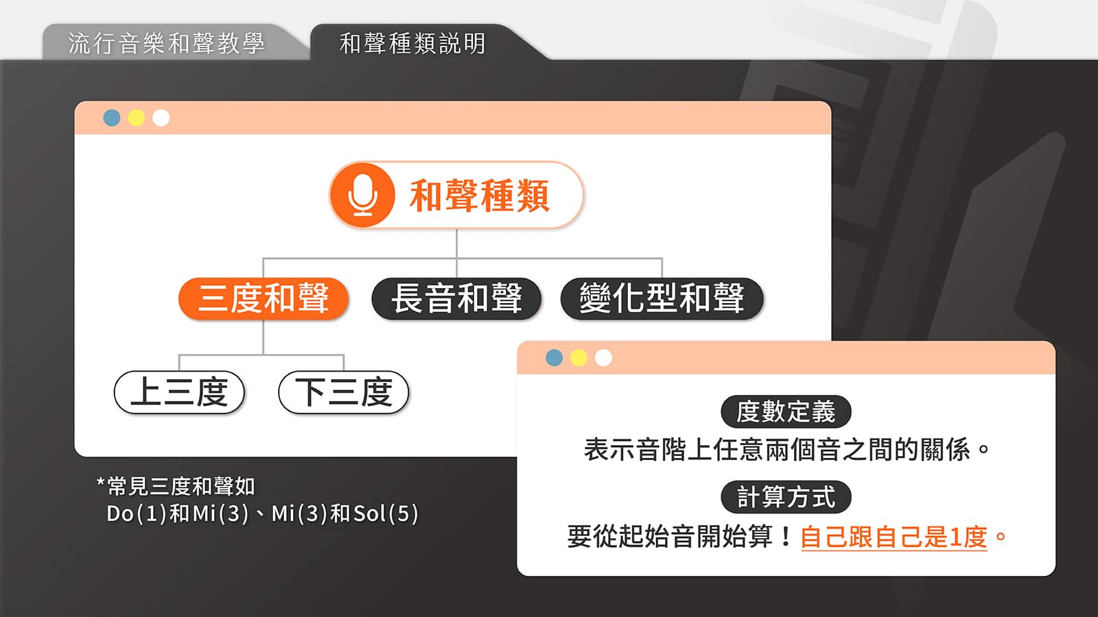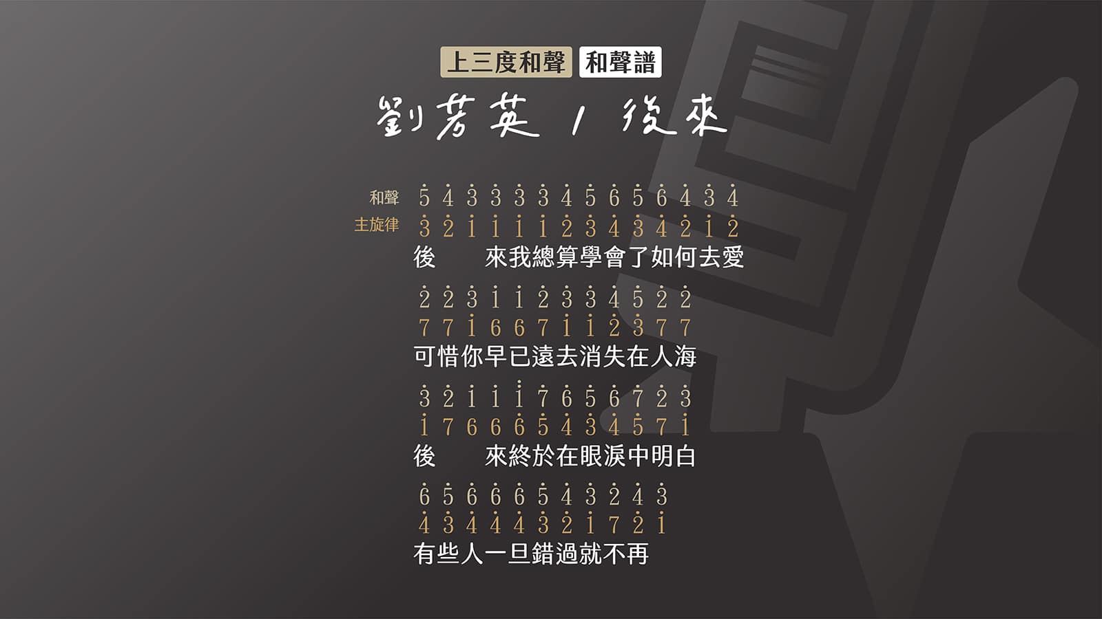 和聲其實有很多不同的呈現方式,如三度和聲、長音和聲、變化型和聲等,而三度和聲就是我們最熟悉也最常聽到的其中一種。三度和聲的特點,就是和聲的旋律會緊貼著主旋律一同起伏,其中比主旋律高的和聲我們會稱呼它為「上三度」或「高三度」和聲,比主旋律低的和聲我們會稱呼它為「下三度」或「低三度」和聲。