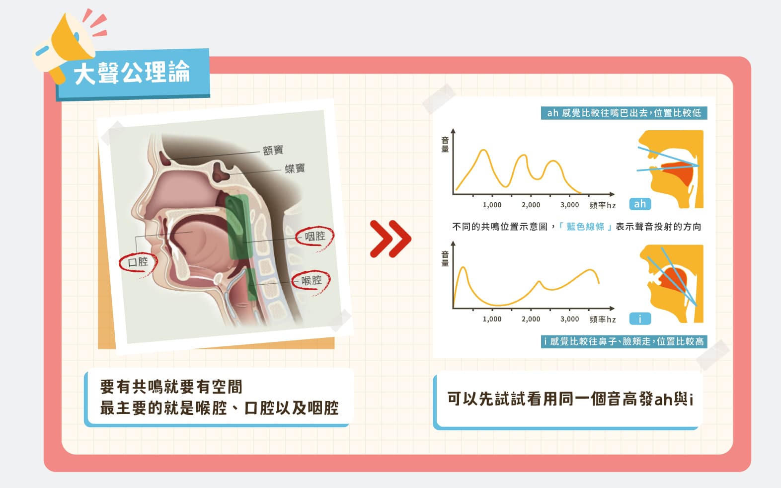 如果要利用這些空間達到聲音從頭頂投射出去的感覺,你可以先試試看用同一個音高發「ah」與「i」這兩個母音,有感覺到聲音的方向跟下圖一樣嗎?