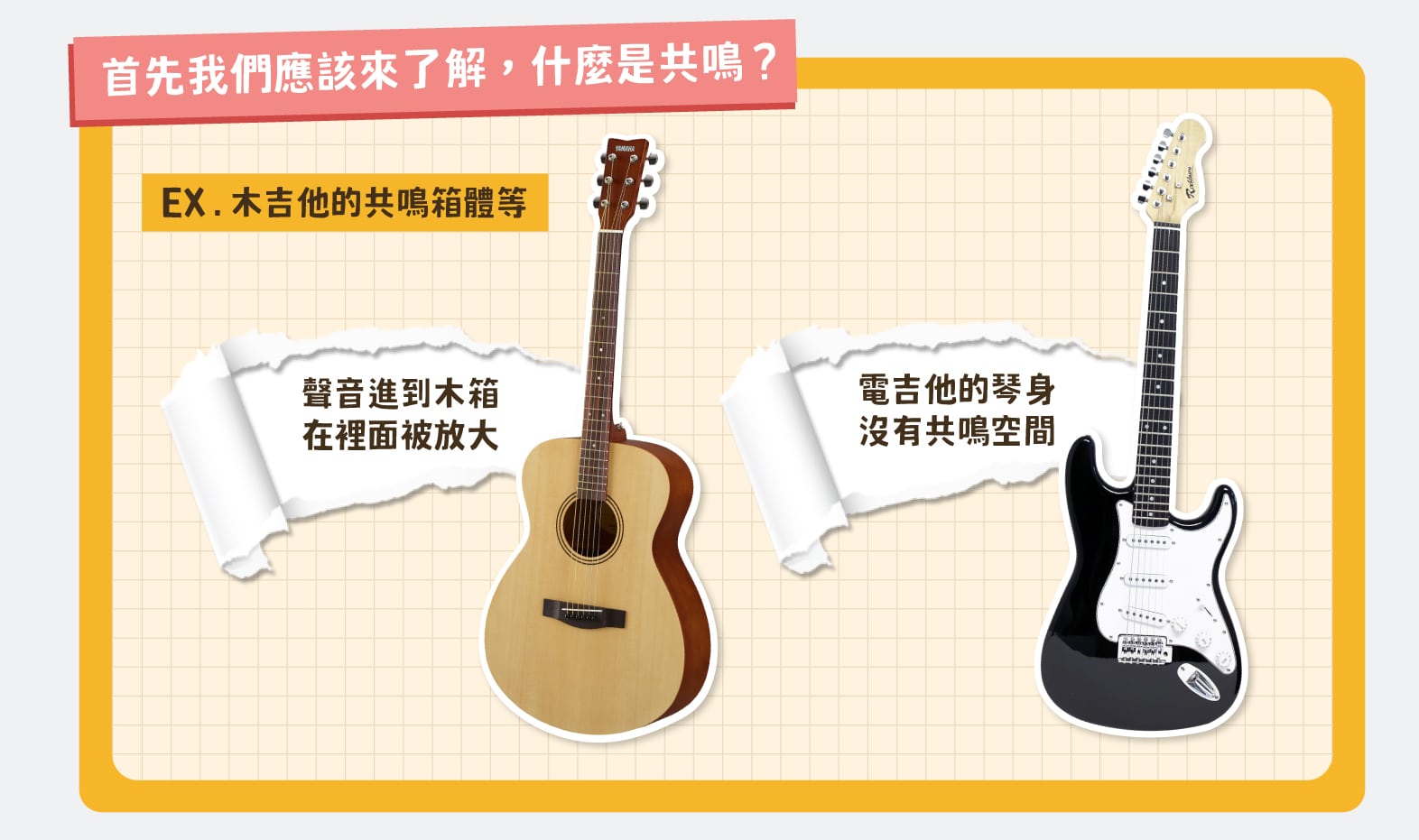 聲音傳到共鳴箱裡面後,因為「駐波原理」讓聲音放大許多。又因為波長的關係,大空間較能放大低頻,小空間較能放大高頻,不同的空間會讓聲音產生不同的音色。