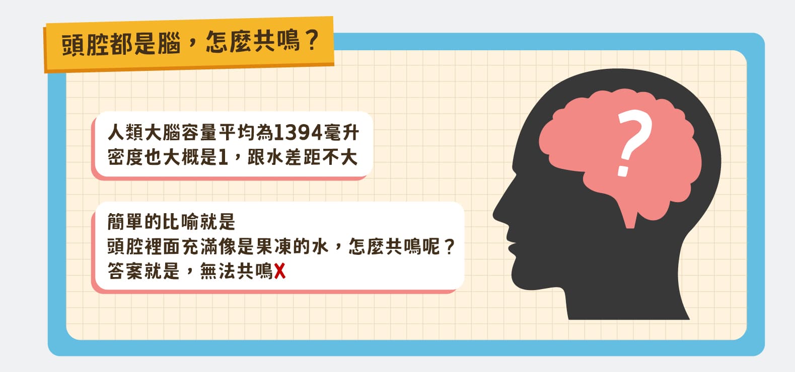 人類大腦的容量平均是1,394毫升,密度大概是1,跟水差距不大。所以簡單的比喻就是「頭腔裡面充滿像是果凍的水」,要怎麼共鳴呢?答案就是:無法共鳴。