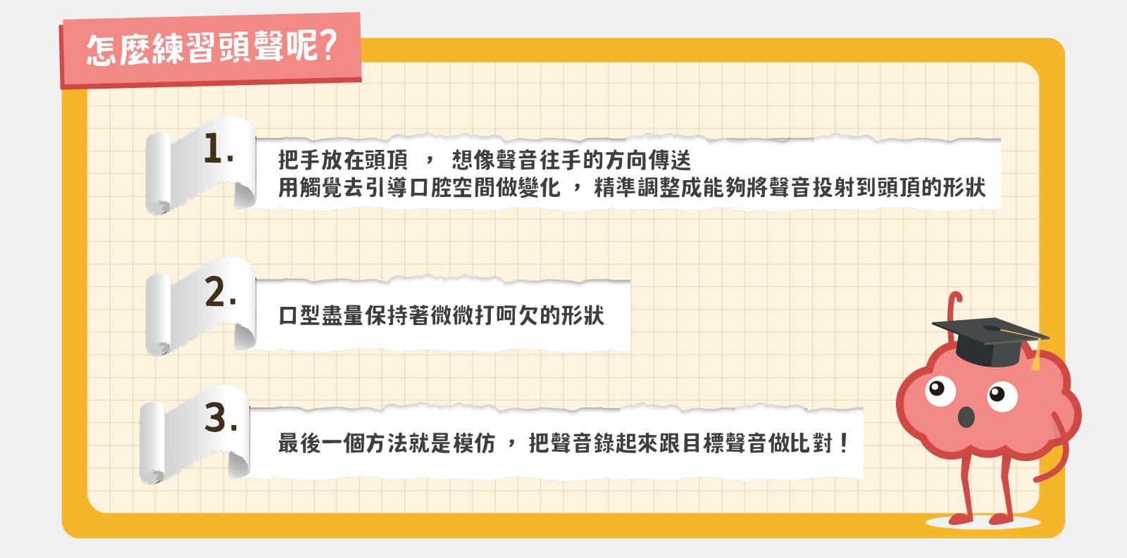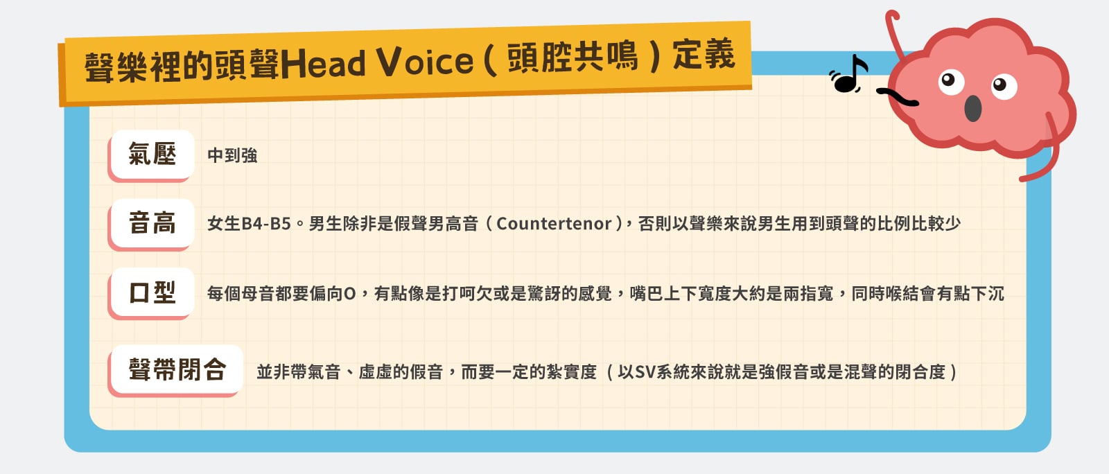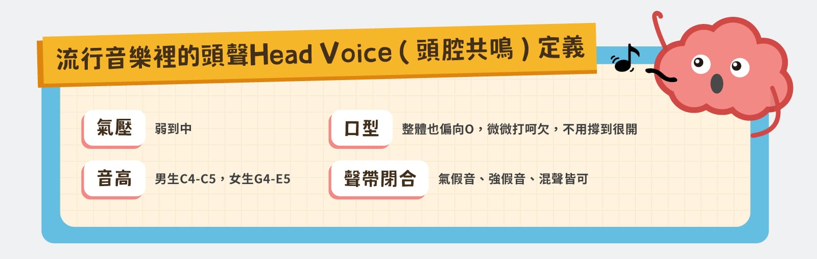 是不是真的「感覺」聲音從頭頂衝出去?沒錯,唱歌名詞的命名原理通常都是描述聽起來或是唱起來的「感覺」,並不是針對動作或是發聲原理喔!
