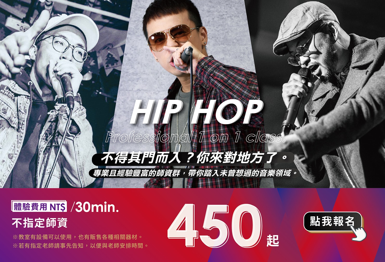 專攻嘻哈、饒舌曲風,從學校社團教學、講座到一對一專業指導皆有豐富經驗。曾合作藝人:熱狗MC Hotdog、大支、熊仔、麻吉弟弟、屁孩Ryan、反骨男孩等。