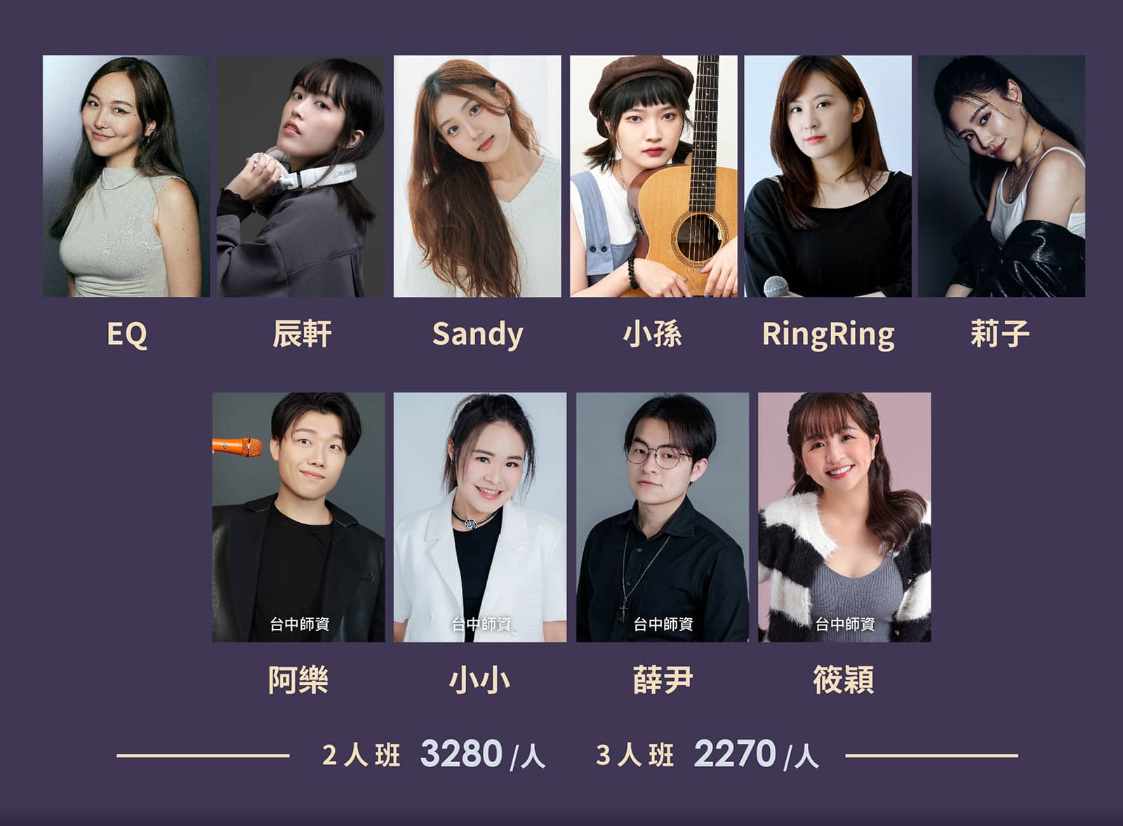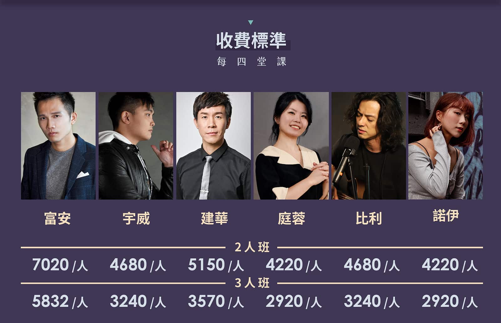 以上表格為新台幣(NT$),課程分為兩人班及三人班。《點擊圖片看師資介紹》