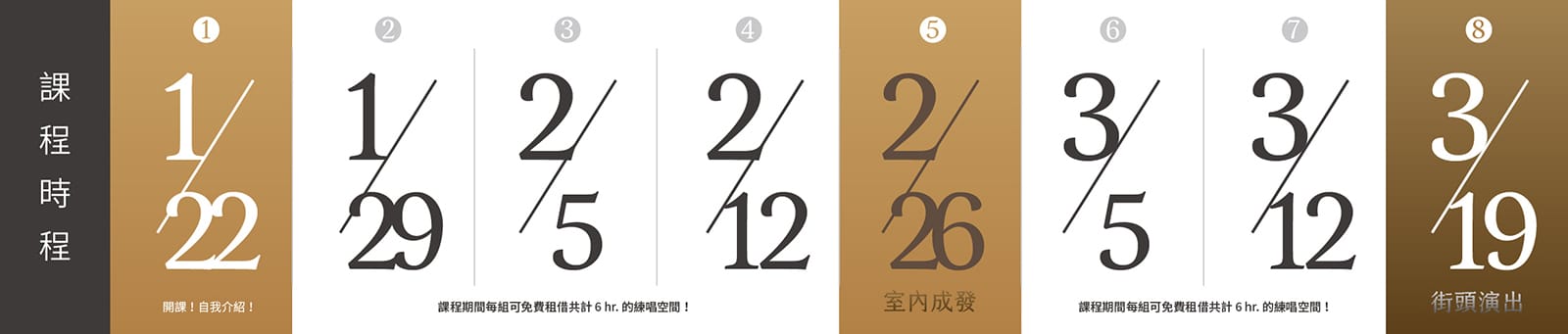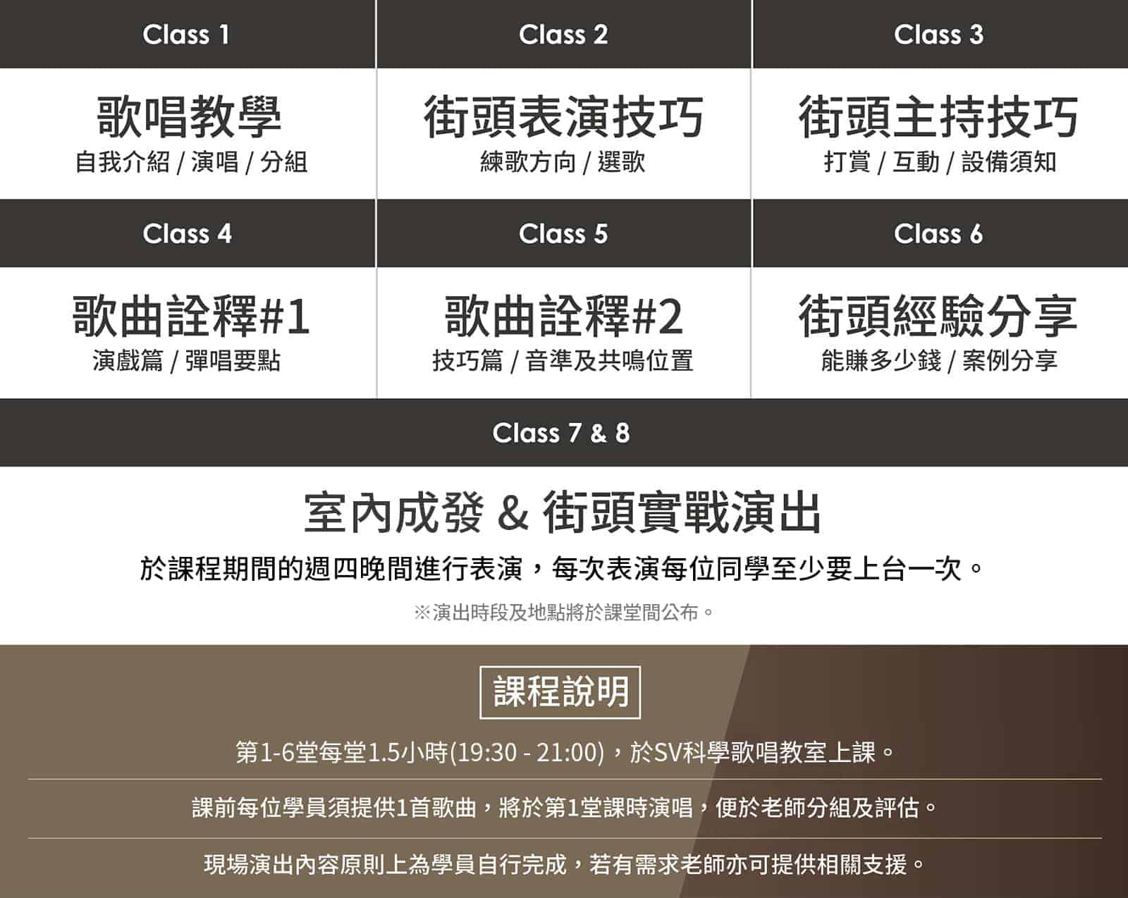 ★ 上課時間:1/22開始每週四晚上19:30~21:00,共計8週。【其中7週在SV教室上課,另有1次街頭實戰演出,共計8堂課】