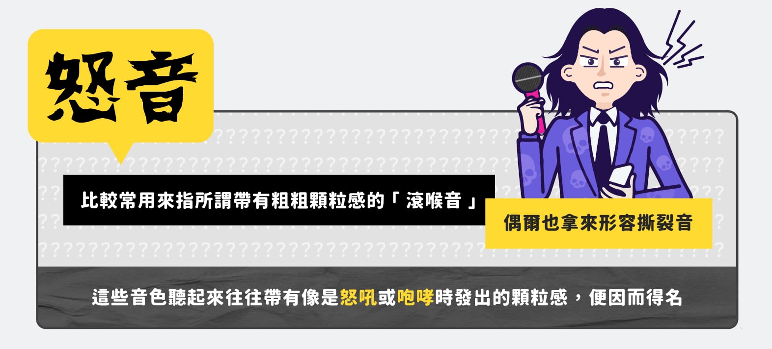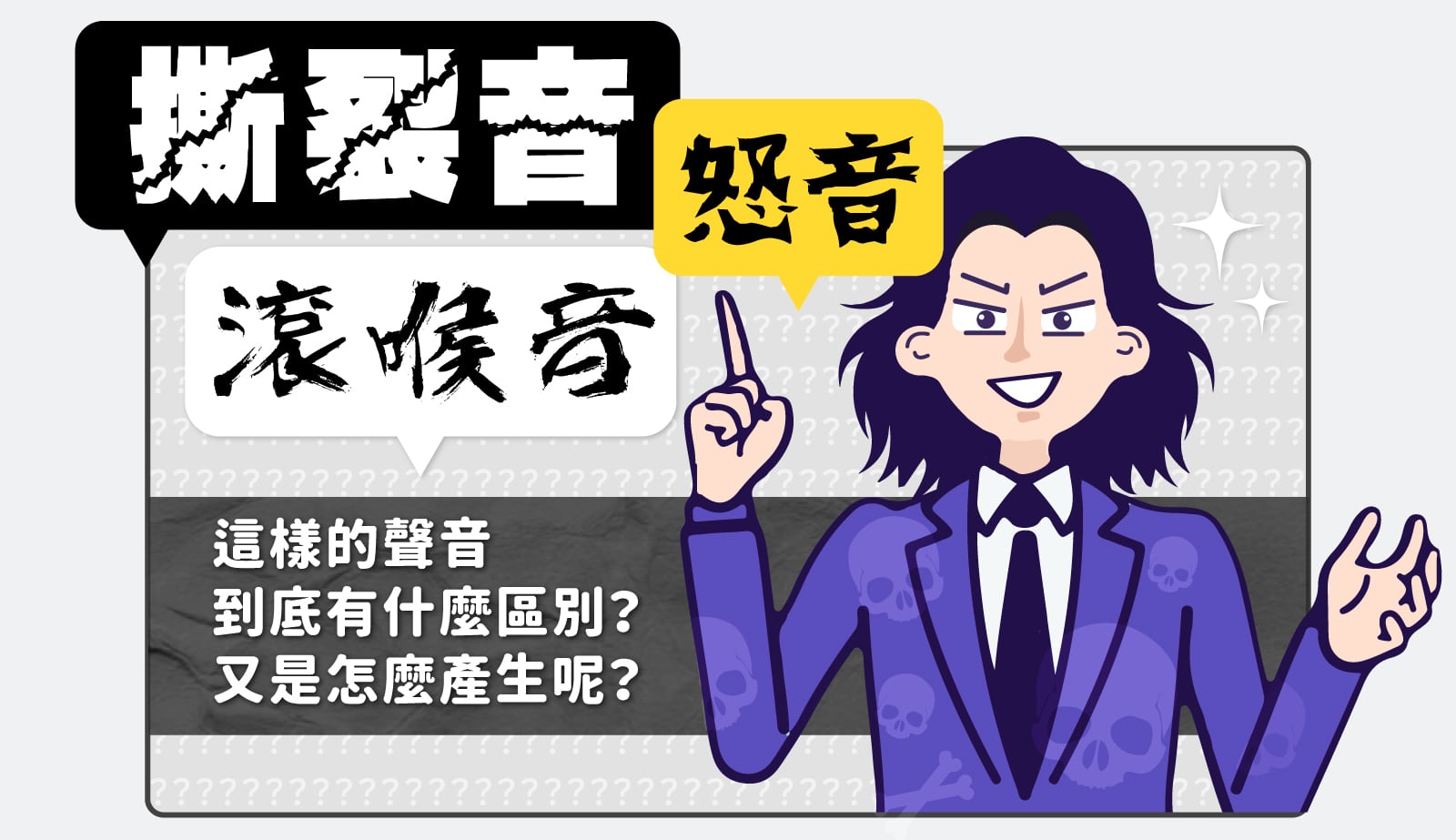 首先我們常常聽到的「怒音」這個字眼,比較常用來指所謂帶有粗粗顆粒感的「滾喉音」,偶爾也拿來形容撕裂音。這些音色聽起來往往帶有像是怒吼或咆哮時發出的顆粒感,便因而得名,那麼以下主要就針對撕裂音跟滾喉音來解說囉~