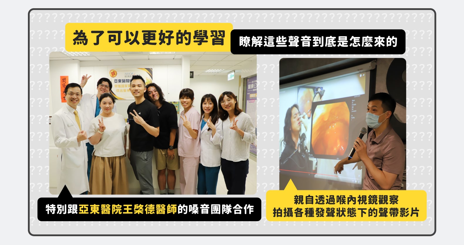 為了搞清楚怎麼樣可以更好的學習,並且瞭解這些特別的聲音到底是怎麼來的,我們除了研究國內外各種相關歌唱及醫學資料,還特別跟亞東醫院王棨德醫師的嗓音團隊合作,親自透過喉內視鏡觀察、拍攝各種發聲狀態下的聲帶影片。雖然網路上已經有許多介紹或解說,但我們SV科學歌唱應該是華語圈第一個實事求是找資料做研究,最有資格來講解這個主題的啦~馬上就來帶大家剖析清楚!