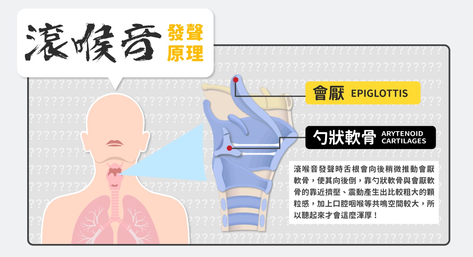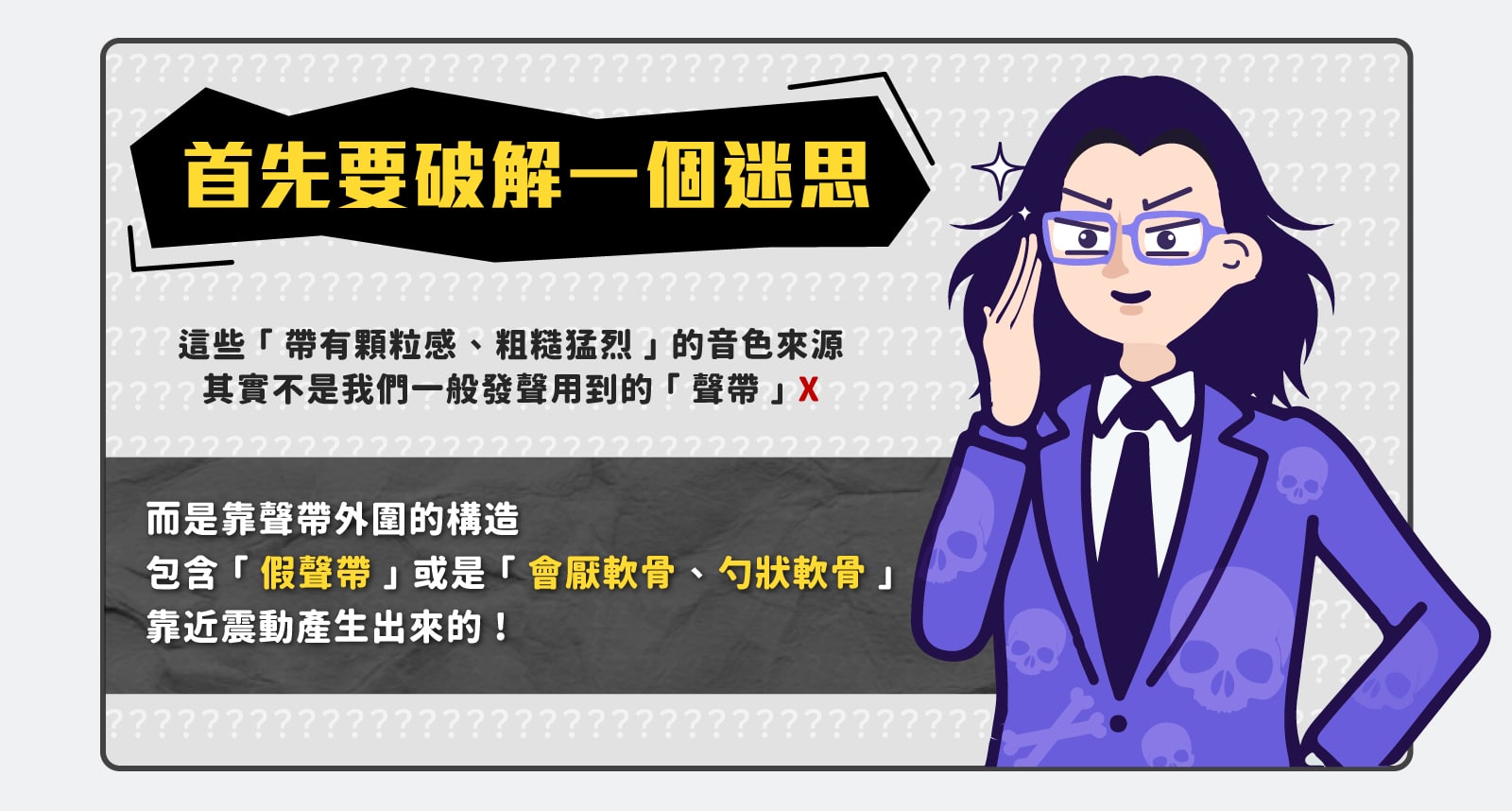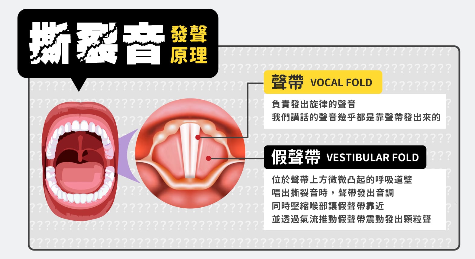 先講結論!首先要破解一個迷思:綜合許多研究資料可以確認,這些「帶有顆粒感、粗糙猛烈」的音色來源,其實不是我們一般發聲用到的「聲帶」,而是靠聲帶外圍的構造,包含「假聲帶」或是「會厭軟骨、勺狀軟骨」靠近震動產生出來的。