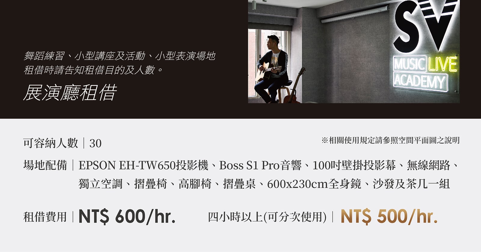 ※優惠方案在使用完畢前加購,可沿用優惠價格。例:購買6小時展演廳租用,時數用完前能夠以優惠價($500/hr)加購時數※