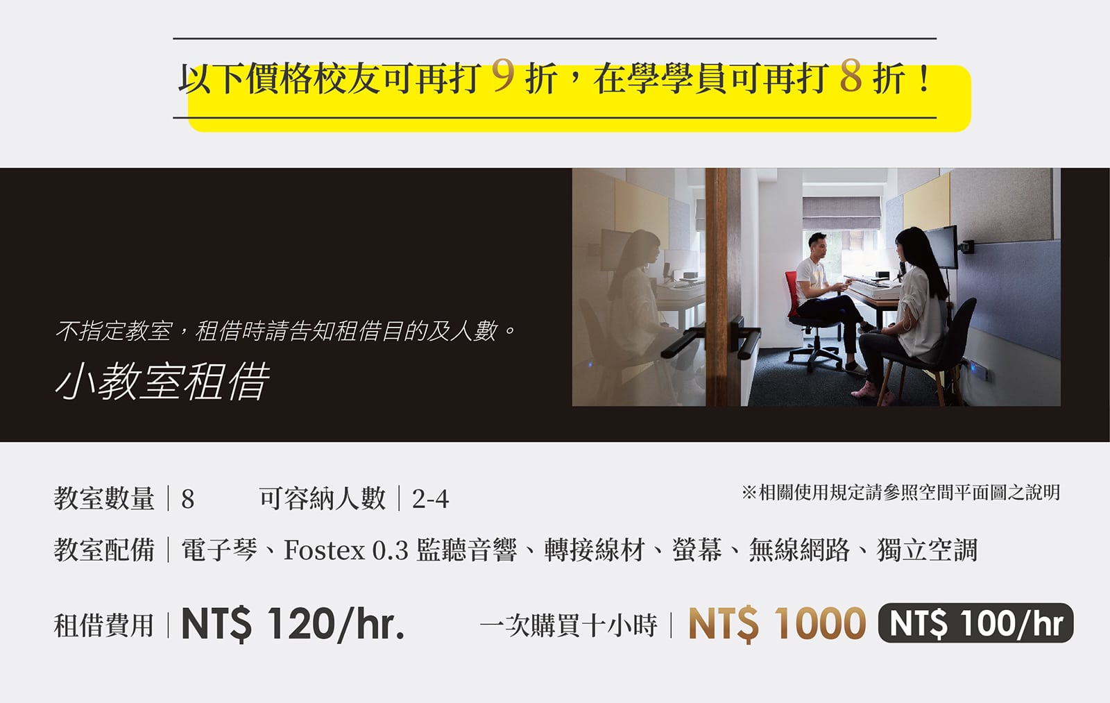 ※空間租用不可退費,一次購買較多時數則使用期限為一年。例:購買6小時優惠則須要在購買日起一年內使用完畢※