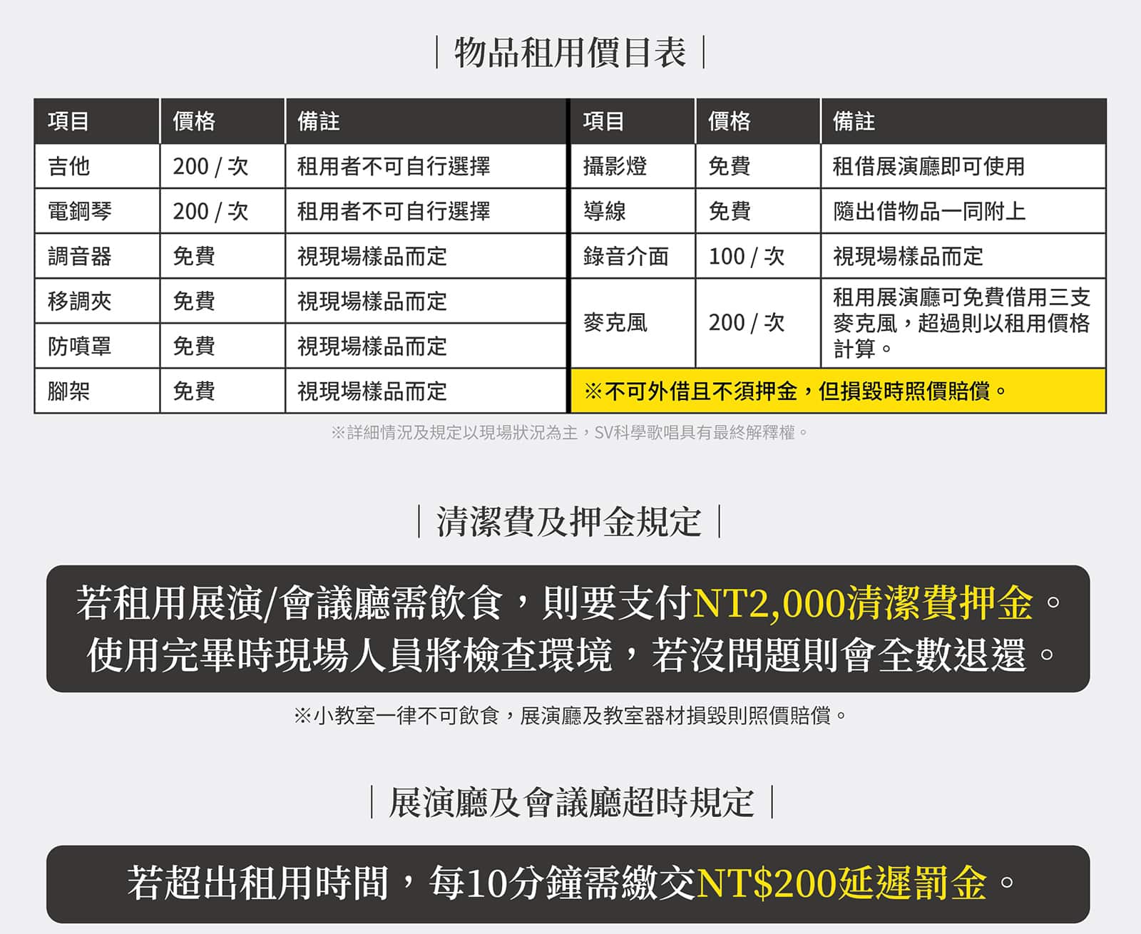 ※租用時櫃檯會告知「起算時間」,若超過租用時數將會加收費用(以一小時為單位)。若要加租時數,需要在租用時間結束前先行告知,否則將以超時計算。