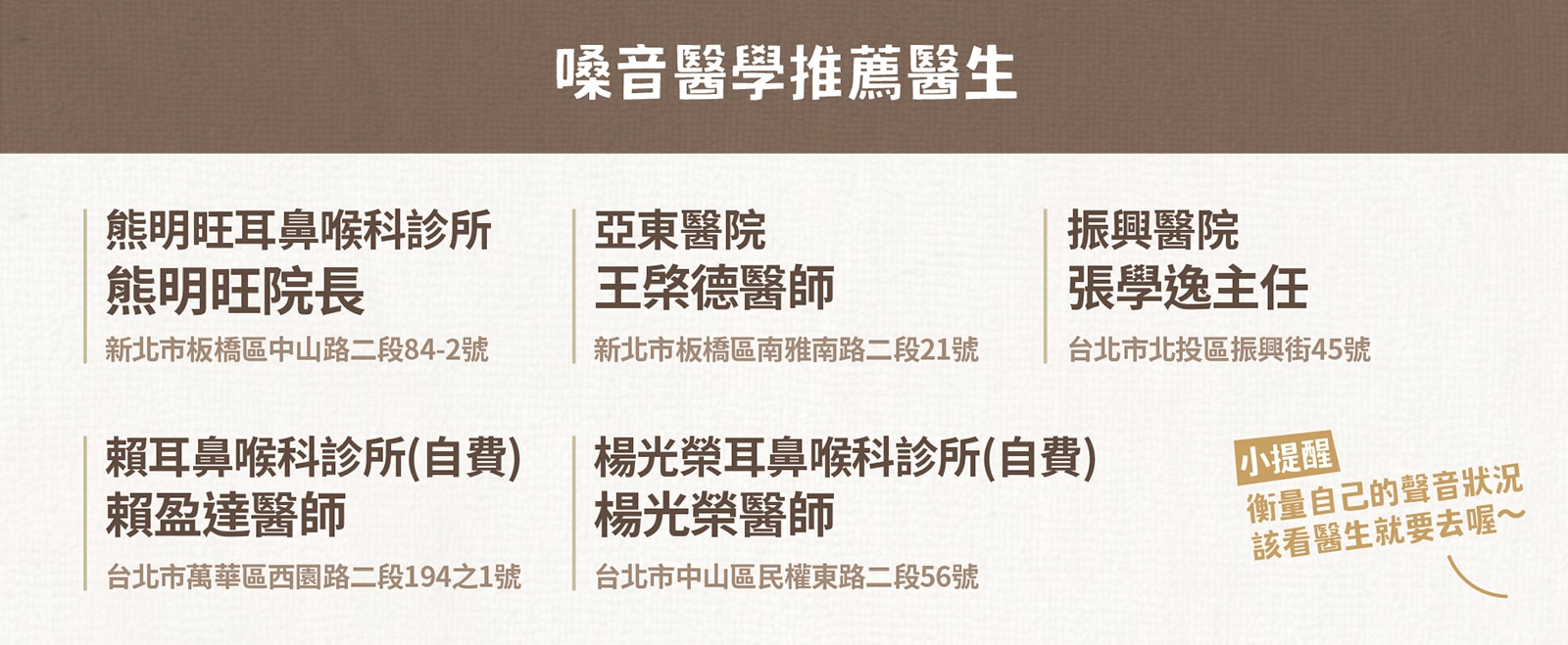 如果是5天以內,原則上不用太擔心,只要參考第三部分的方法,順利的話2-3天內就會恢復囉!如果已經沙啞超過兩週,會建議去有喉內視鏡的醫院或診所看診,因為有可能是聲帶小結、聲帶息肉、聲帶長繭或聲帶囊腫之類的狀況。如果有以上這些症狀也不用太擔心,根據熊明旺醫師的說法,聲音沙啞的時間在半年內的話,很有可能是屬於紅嫩的繭,只要服用消腫藥物、定期追蹤、多休息,約2-3週就能改善,記得千萬不要鴕鳥心態啊!雖然我很懂這種感受──不去面對就好像不存在,但是建議大家勇敢面對自己的聲帶問題,越早發現越容易治療喔!下面這個列表,是我推薦的幾位對於嗓音醫學有專門研究的醫生,大家可以參考看看喔~(PS 這不是業配)
