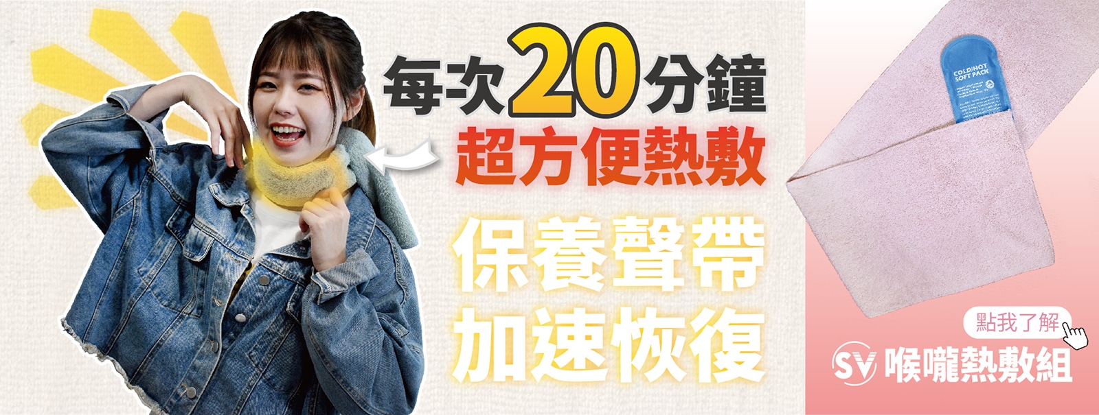 經過非常多的嘗試後,終於找到一個超方便的方法:首先是購買一個可以微波的長形熱敷袋,只要丟進微波爐不到一分鐘就能完成加熱。不過加熱時要專心盯著,以免加熱過頭讓裡面的液體氣化,熱敷袋會直接爆掉~我自己已經不小心弄爆好幾個了。接著買一條長120公分的柔軟小毛巾,中間沾濕幫助導熱,捲起來以後就可以直接綁在脖子上囉!這邊要注意,一般的小毛巾只有大約75公分,繞過脖子後會綁不起來。覺得還要特地去找這樣的毛巾跟熱敷袋組合很麻煩?SV都幫你找好啦~台灣製造的長條型熱敷袋加上超柔軟長120公分的毛巾,組合價只要350元,每天20分鐘照顧你的喉嚨!